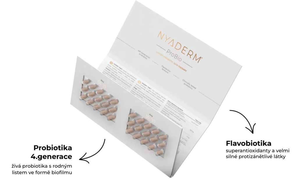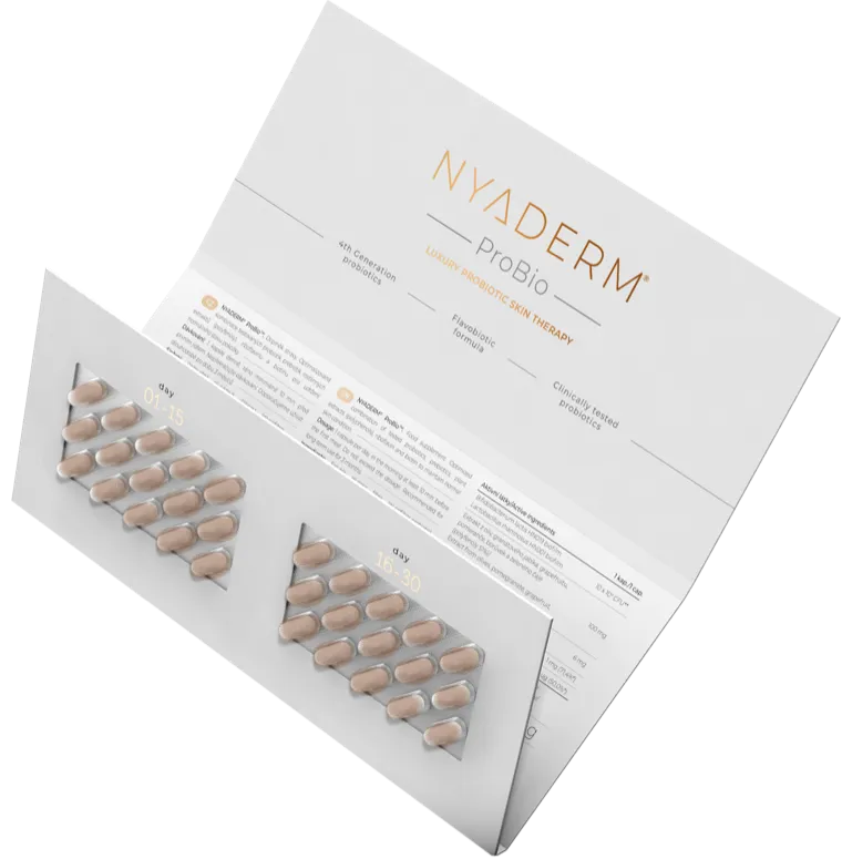 NYADERM® ProBio is a unique dietary supplement containing an optimised combination of clinically tested 4th generation probiotics, prebiotics, flavobiotics, riboflavin and biotin.
