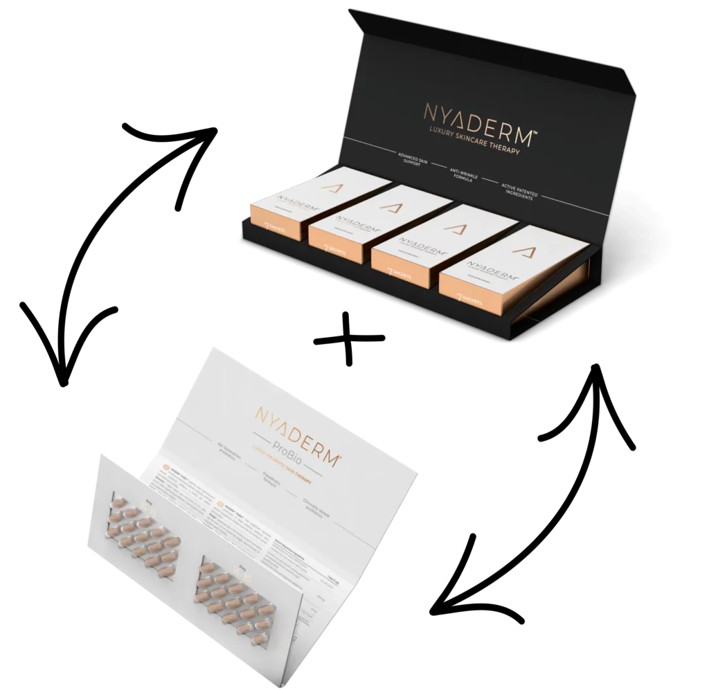 The simultaneous use of NYADERM® Anti-Aging drink and NYADERM® ProBio is the highest level of skin, hair and nail care. The use of both unique products at the same time is professionally referred to as the “symbiotic effect” because they work together towards one goal. This is very effective and practical, because the intestinal microbiome plays a key role in the digestion of certain food components and supports the creation of an environment in the intestine necessary for the optimal absorption of important nutrients. This will significantly increase the bioavailability of specific nutrients and protective substances that are necessary for the renewal and protection of the skin.”