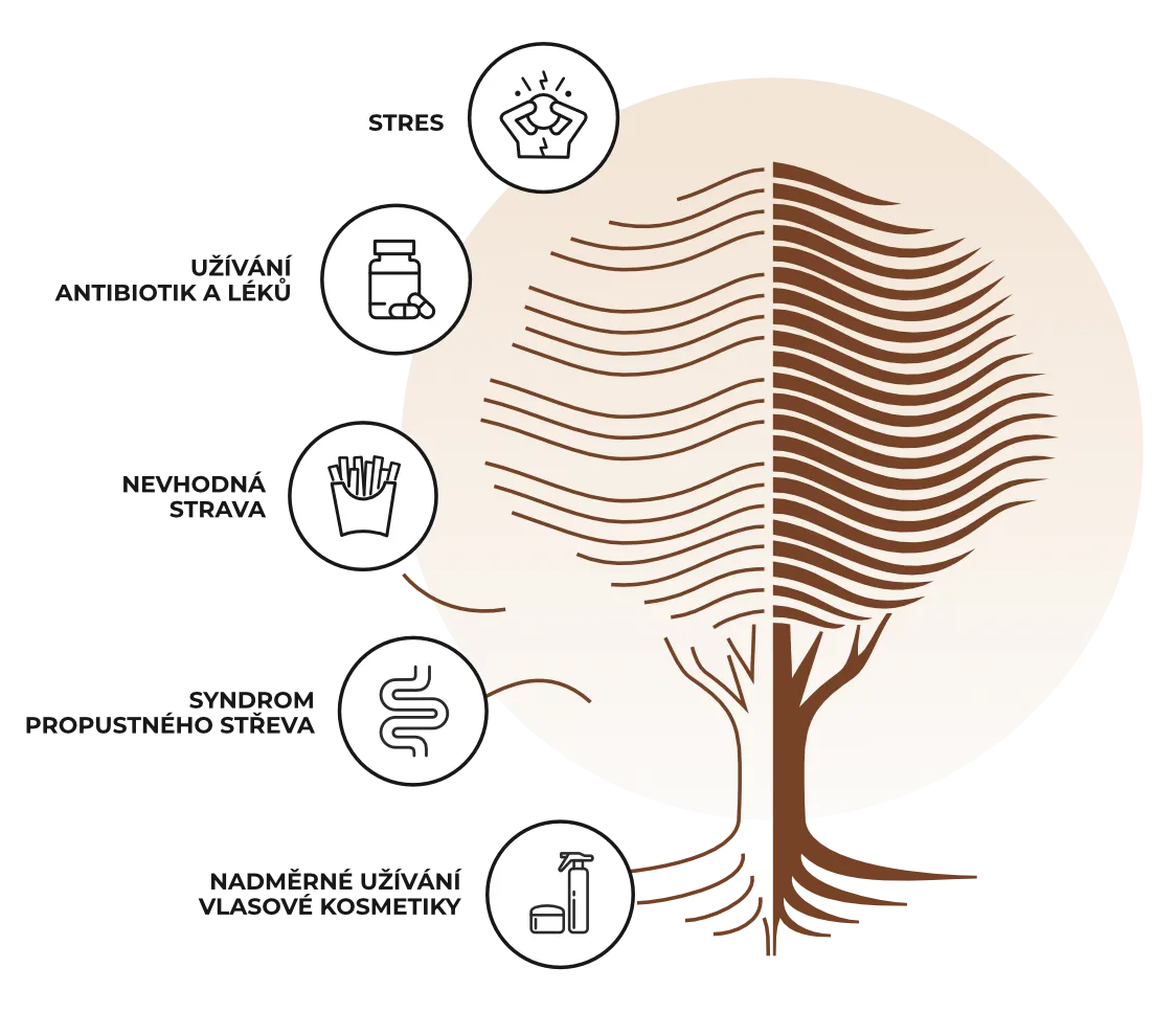 Zajímají vás příčiny nadměrného vypadávání vlasů u žen i mužů (alopecie), pomalého růstu vlasů nebo vás zajímá, proč nemají vaše vlasy objem a nevypadají zdravě? Mezi největší hrozby pro zdravý střevní mikrobiom patří stres, užívání antibiotik nebo léků a špatná strava. Vyhýbání se probiotickým přípravkům a nadměrné používání kosmetických přípravků na vlasy snižuje kvalitu a rozmanitost mikrobiomu (dysbióza) ve střevech i na pokožce a vlasech.1a
