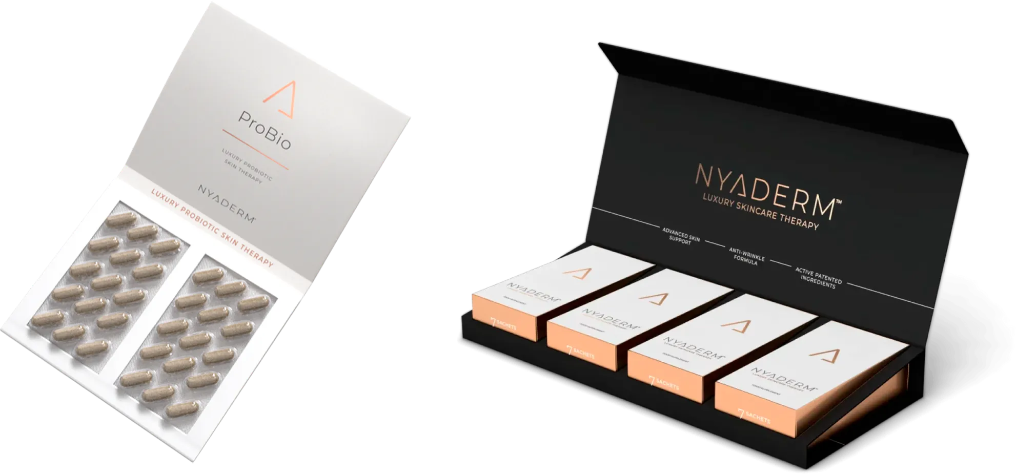 NYADERM® ProBio doporučujeme užívat vždy ráno před prvním jídlem, NYADERM® Anti-aging drink s odstupem min. 2 hodin po NYADERM® ProBio (ne dříve) nebo v průběhu dne vždy mezi jídly (1).